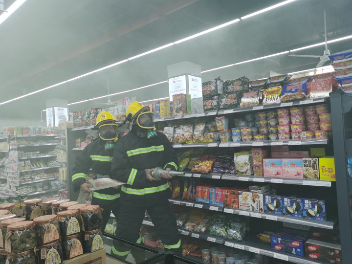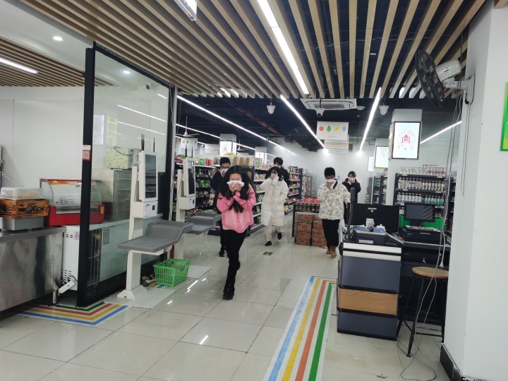 13:30演练正式开始,校卫队在江南超市使用烟雾罐模拟突发火灾,超市负责人进行“校园110”报警,与此同时,超市内工作人员和学生捂住口鼻,弯腰匍匐前进,快速有序逃离现场。接到报警后,校卫队微型消防站紧急出警,3分钟内到达现场,使用消火栓进行突发火灾应急处置。
