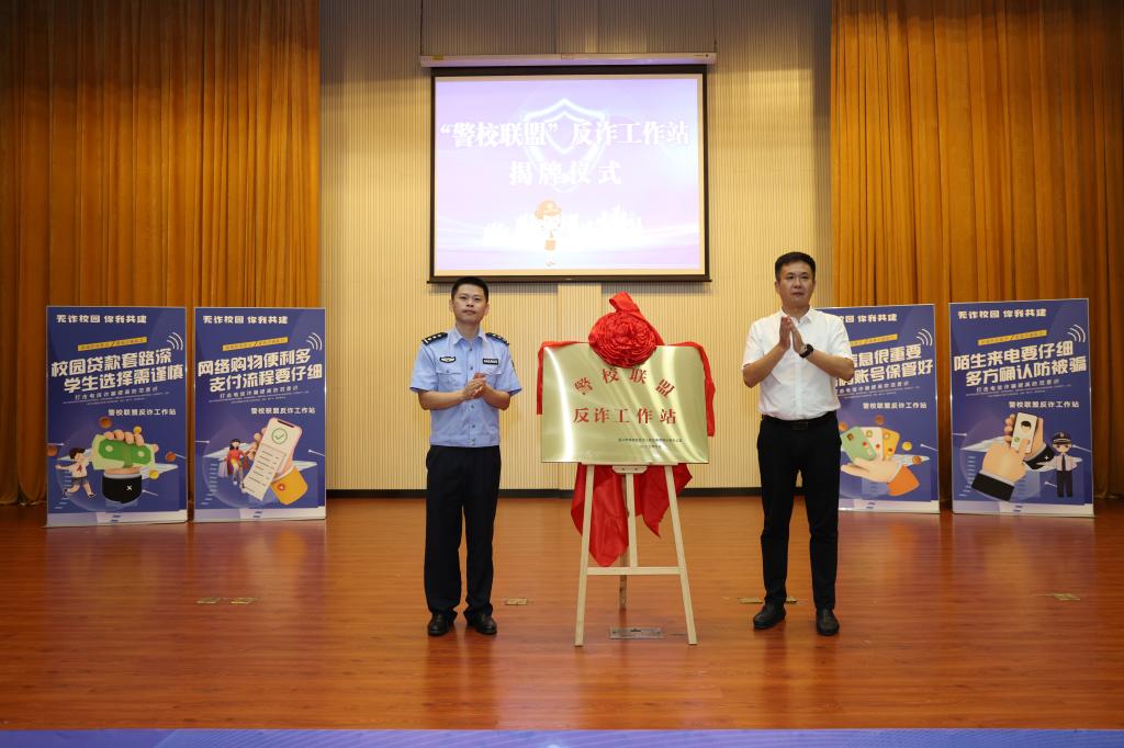 活动现场,嘉兴市南湖区公安局刑事犯罪侦查中心教导员陈凯和我校安全保卫处副处长刘欢共同为“警校联盟反诈工作站”揭牌。