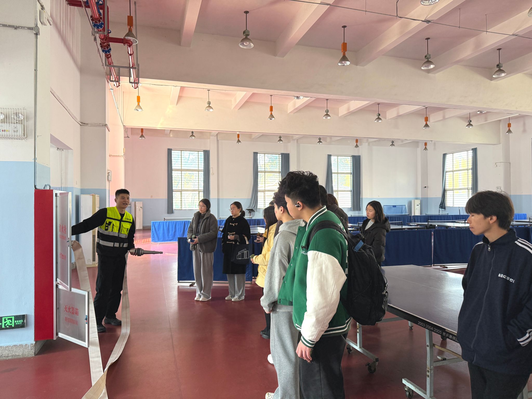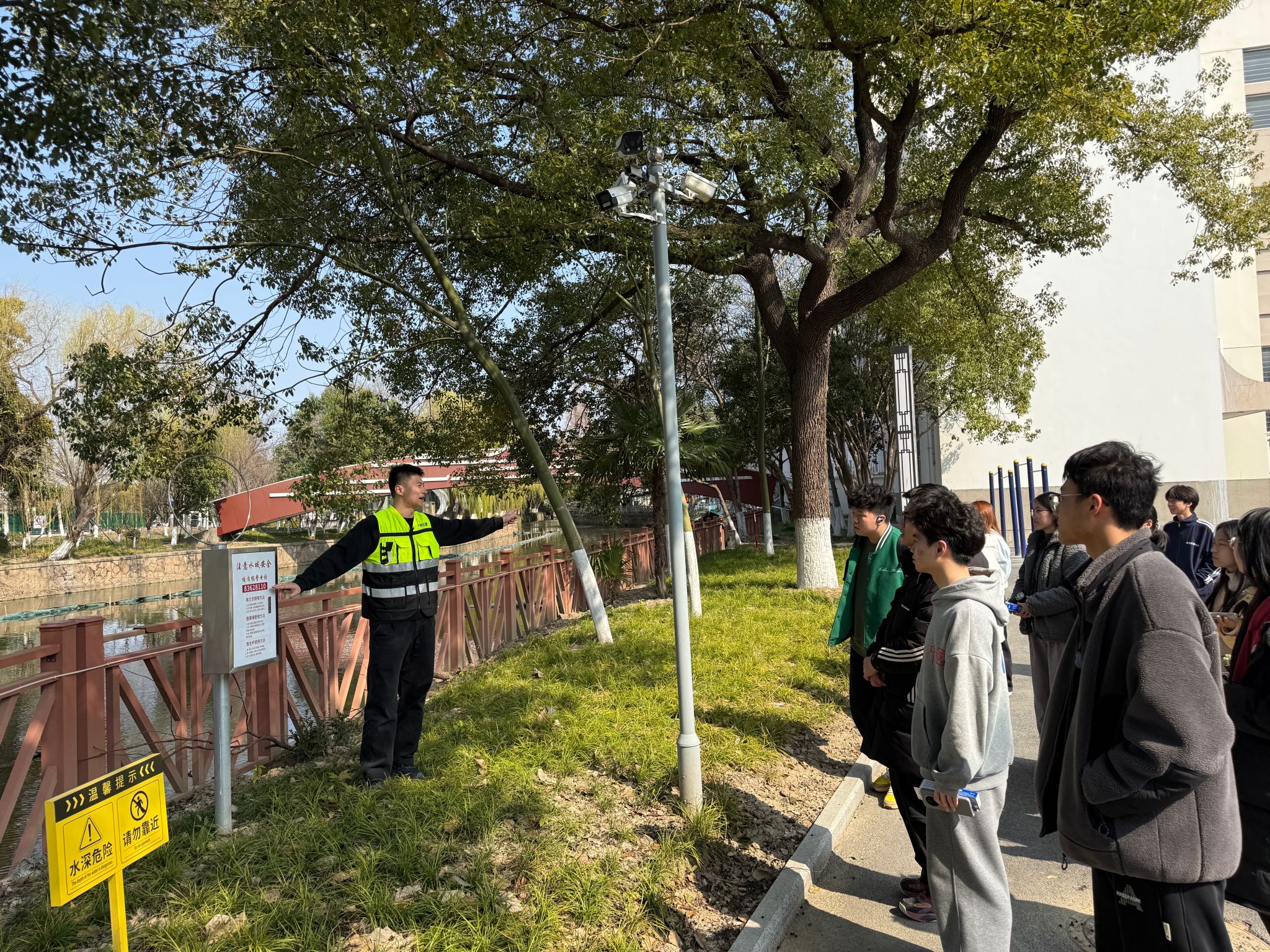 活动中,学校“义警队”队长结合当前校园高发的电信网络诈骗典型案例开展专题宣讲,深入剖析诈骗手法,传授防范技巧,帮助学生提升风险识别与应急应对能力。宣讲结束后,工作人员带领学生前往消防重点部位,现场讲解室内消防栓的正确使用方法。并沿河岸介绍水域救援设备,演示救生圈、救生衣、救生杆、救生绳等救援器材的操作要领,帮助学生掌握基本的自救互救技能。