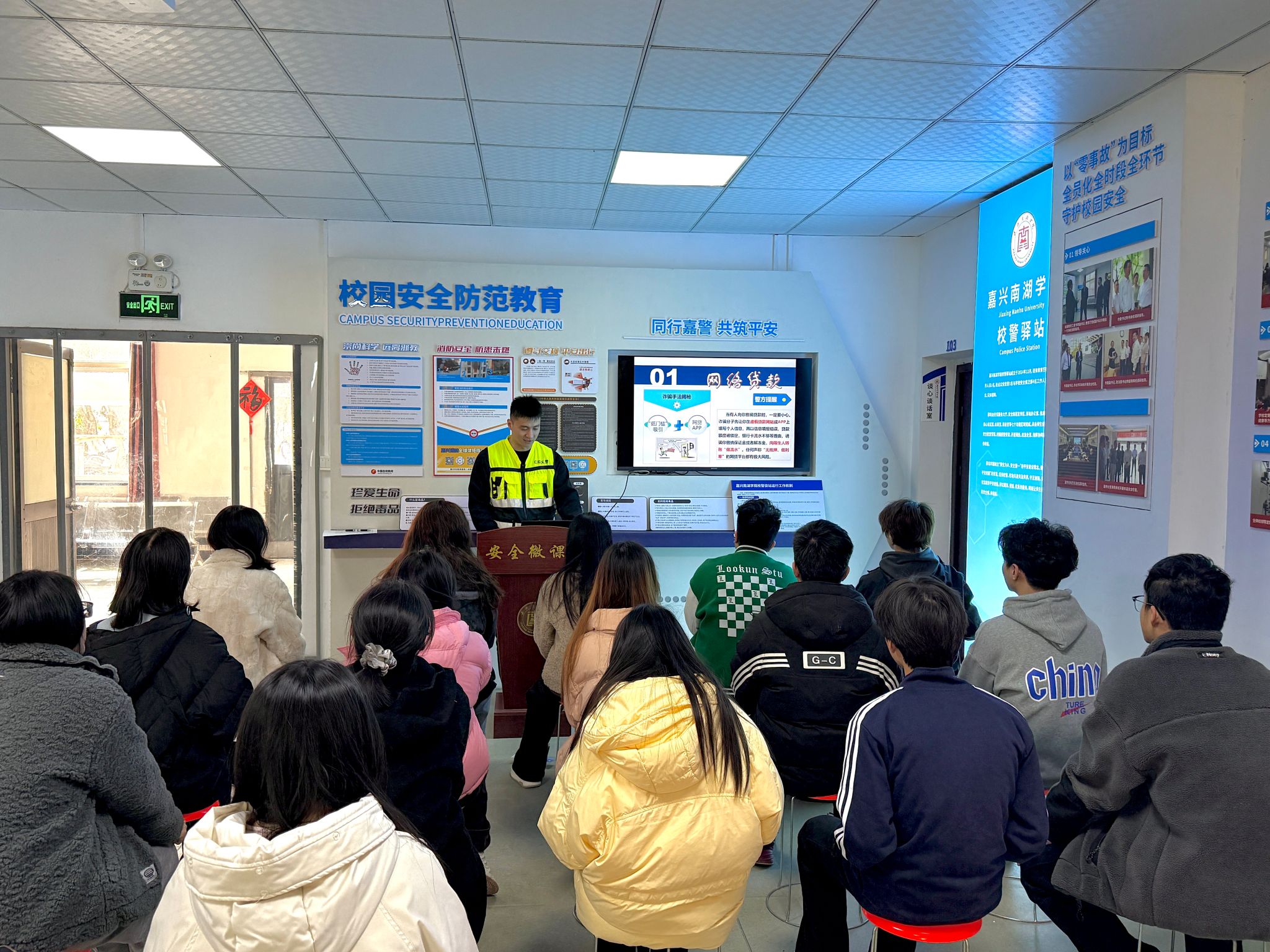 3月12日,嘉兴南湖学院“校警驿站”联合新兴派出所开展“红船义警”安全微课堂教育活动。活动通过理论宣讲与实践教学相结合的方式,进一步增强学生安全防范意识,助力平安校园建设。
